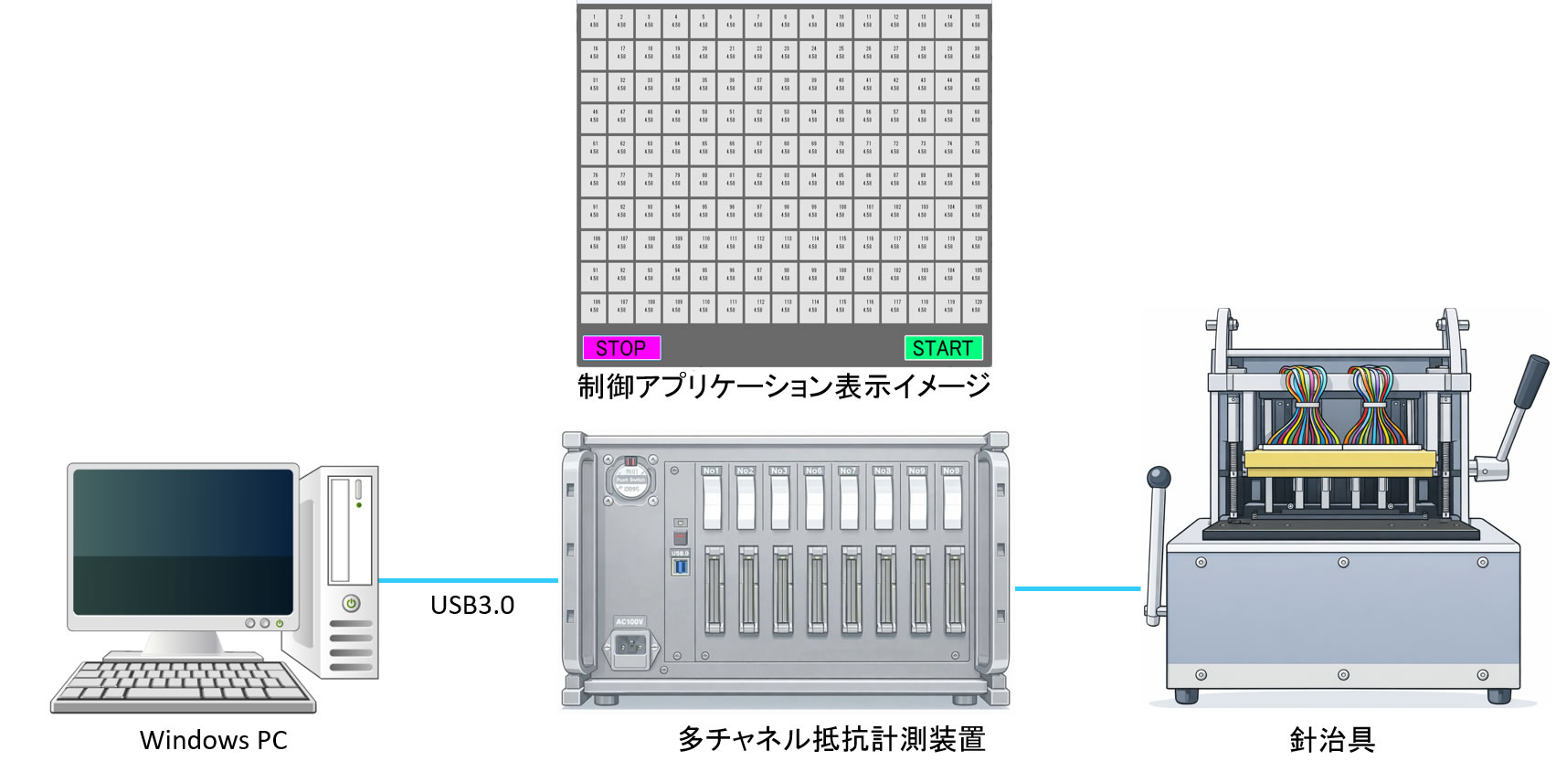 お客様基板の抵抗測定に時間がかかってしまう。同時に複数チャネル(最大600チャネル)の抵抗測定を行う基板検査システムを開発し、タクトを短縮しました。新栄電子複数チャネル抵抗測定システム【特長】 ・システムとして最大600ch(4計測ユニット接続時)の抵抗の同時測定が可能。 ・PC内に結果ログデータを自動保存。 ・測定物に合わせた治具の製作可能。