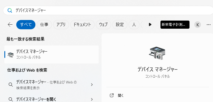 3)検索窓が表示されるので、“デバイスマネージャー”と入力し、[開く]をクリックしてください。