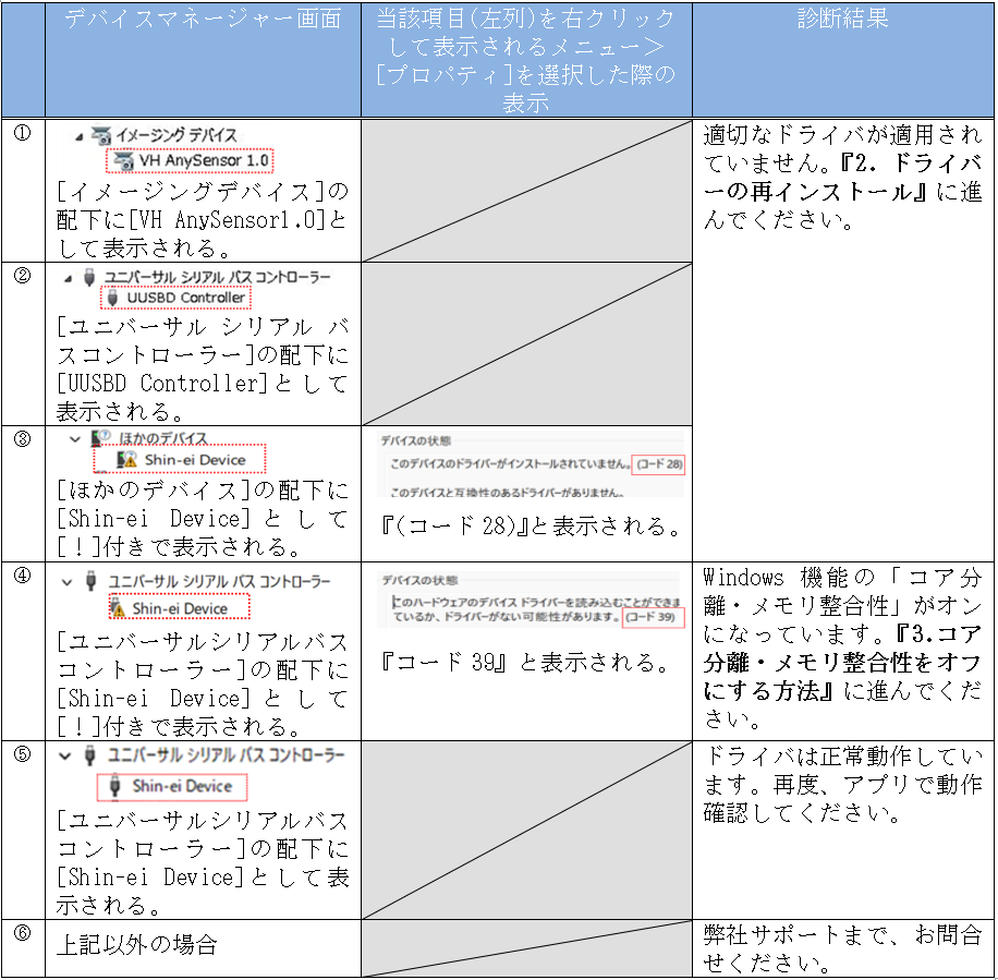 お客様の環境下で必要な処置を判断するために、下記手順に従って、診断(デバイスマネージャーの起動とフローチャートの確認)を行ってください。