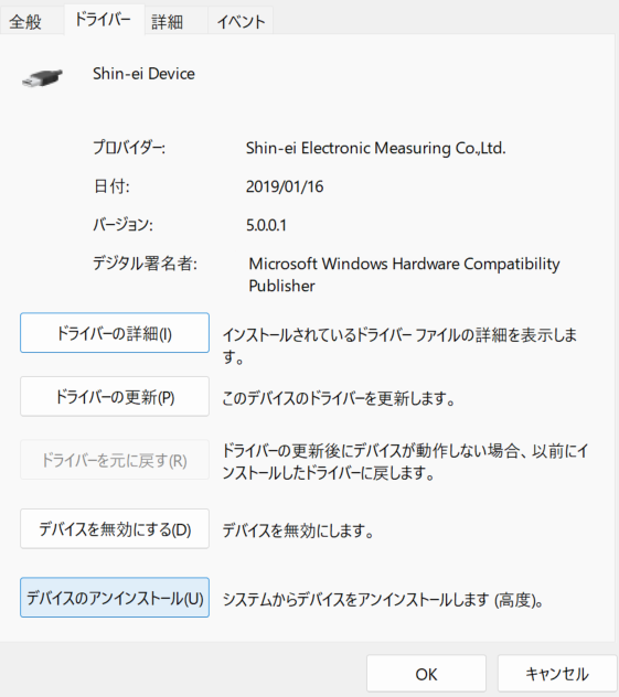 2)「ドライバー」タブを選択し、「デバイスのアンインストール」をクリックします。