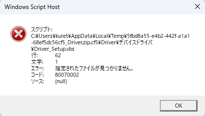 「Driver.zip」を解凍せずに、「Driver_Setup.vbs」を実行すると、以下の画像のエラーとなります。「OK」を押し、「Driver.zip」を解凍後、同様の手順を繰り返してください。